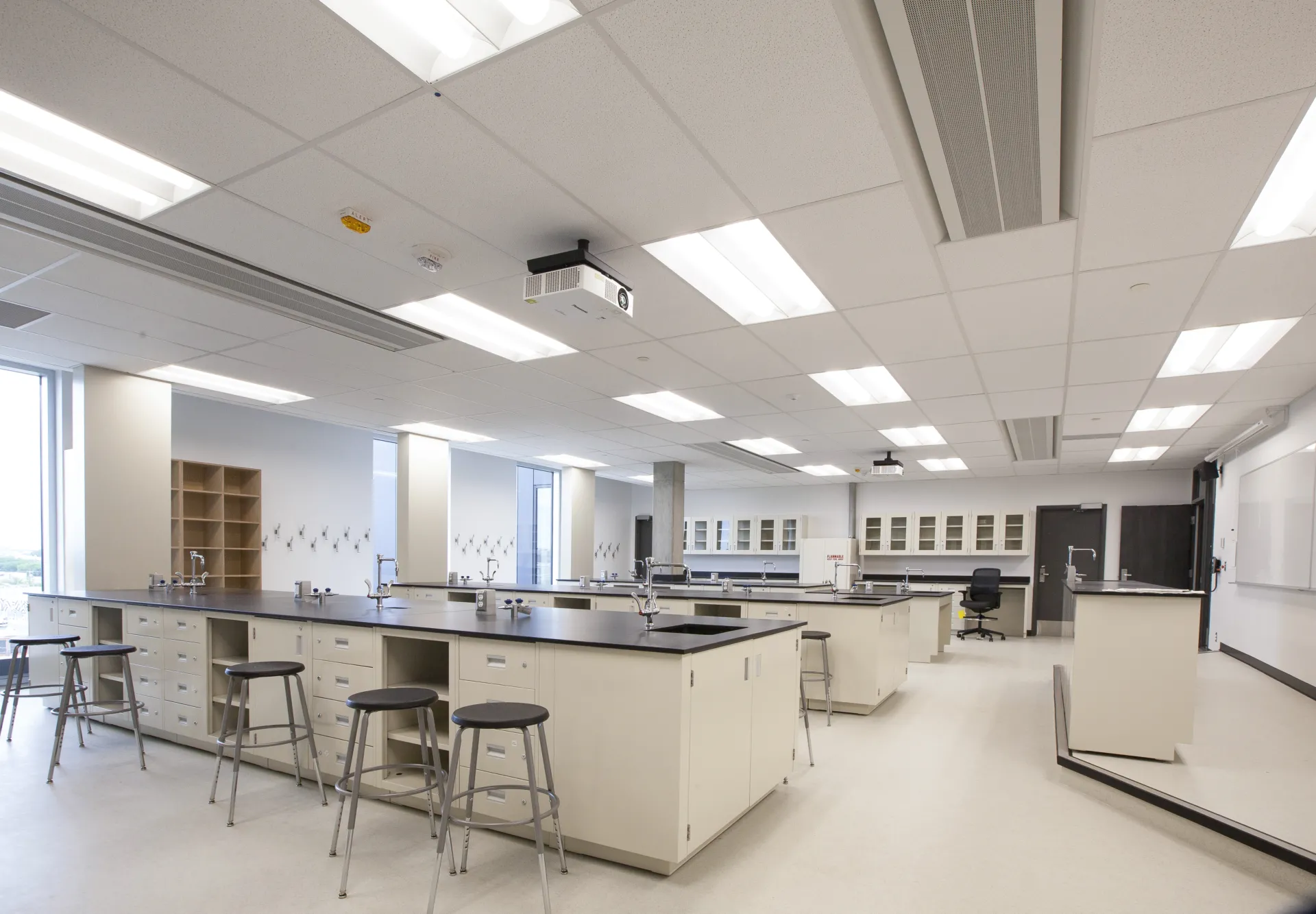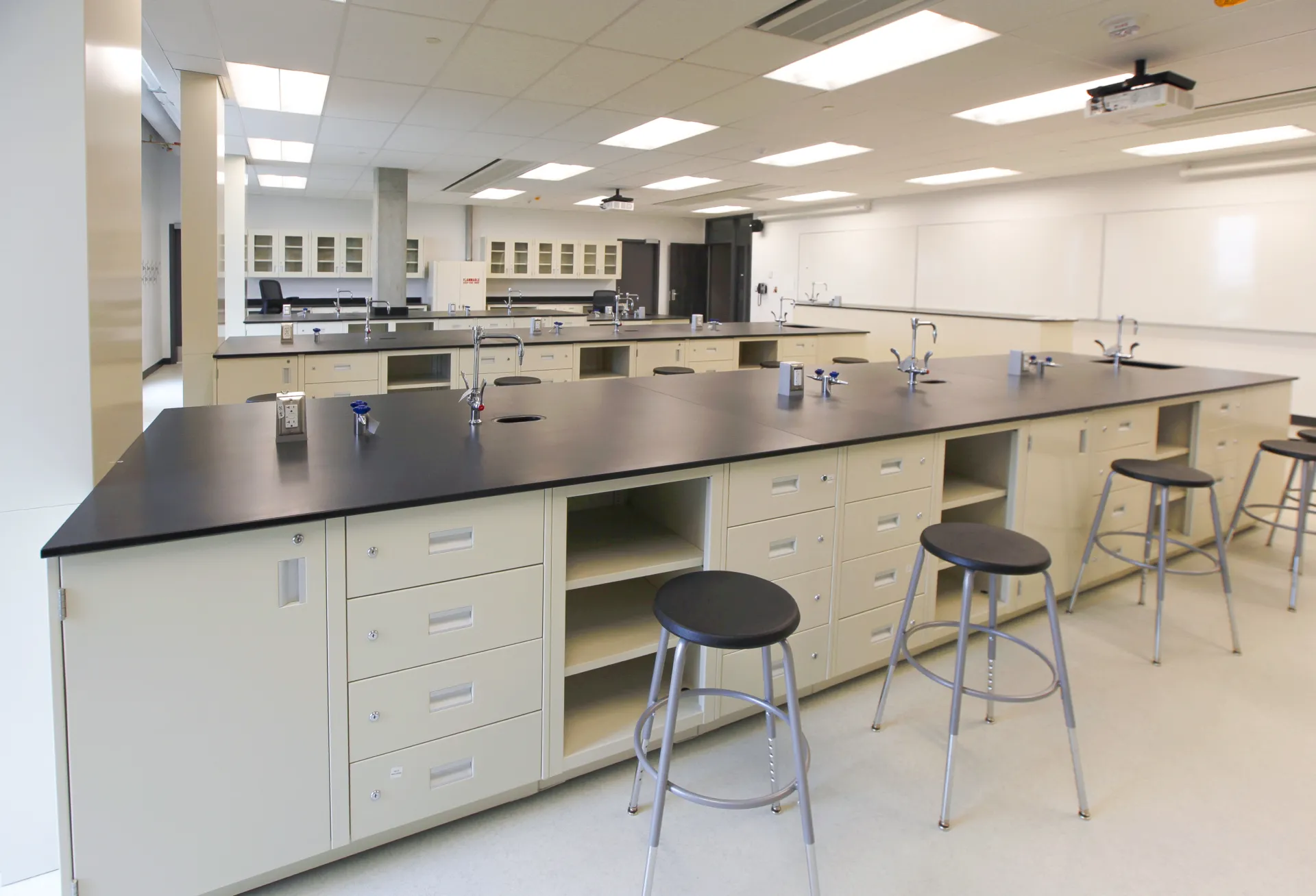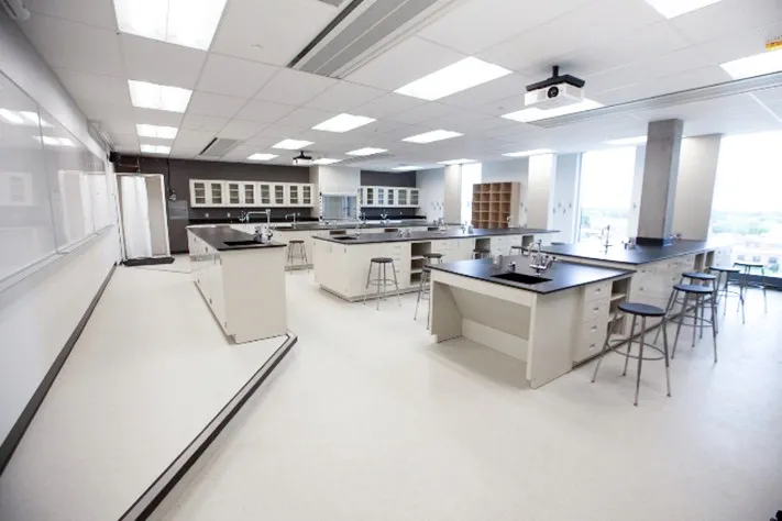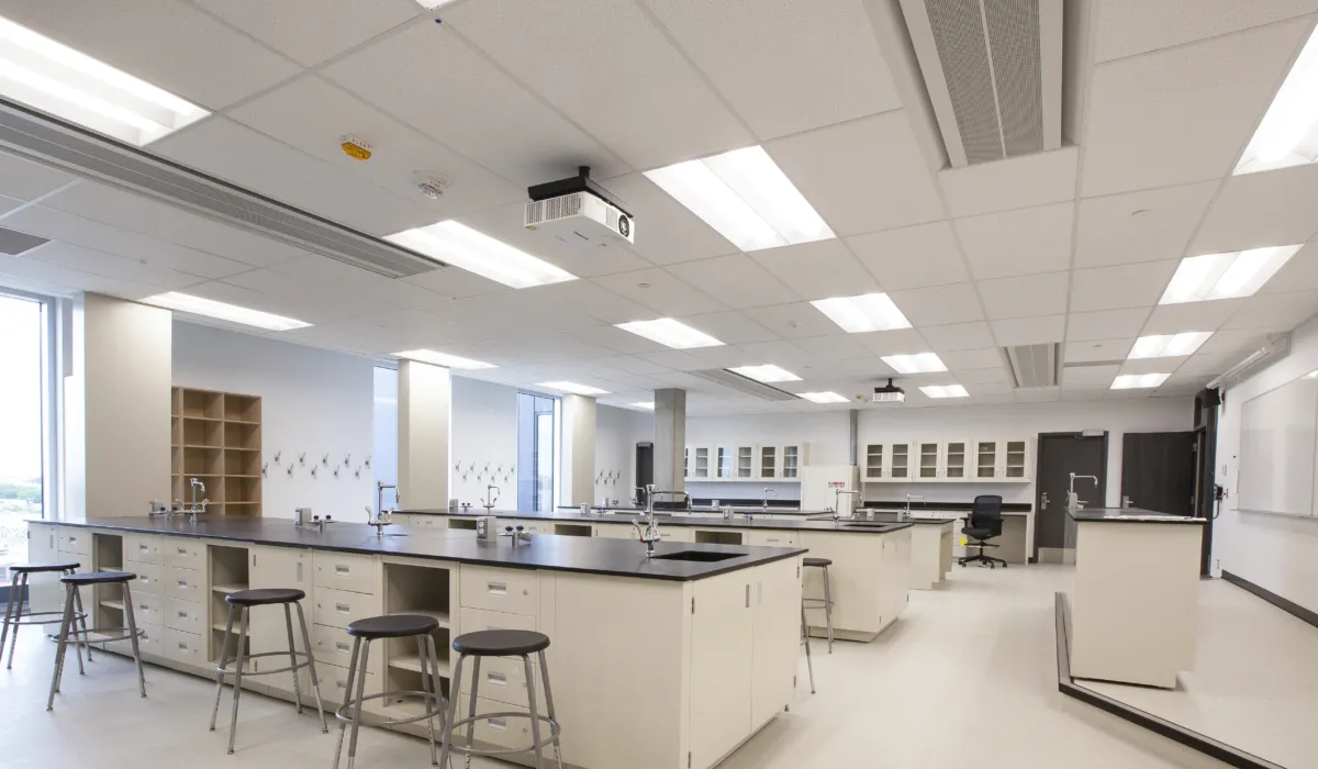 The fifth floor was reconfigured to accommodate chemistry, biology, and physics laboratories, each designed with specialized layouts, dedicated services, and robust safety infrastructure. New lab environments include fume hoods, stainless steel ducting, chemical storage, laboratory benching with integrated services and sinks, emergency shower facilities, and chemical-resistant finishes suitable for heavy academic use. Spaces were planned to support hands-on instruction while maintaining clear circulation and functional adjacencies between labs, prep areas, and classrooms.