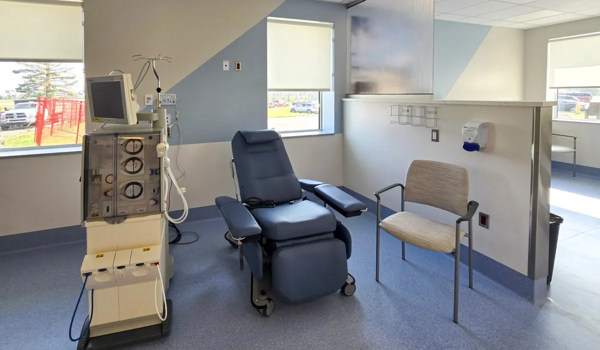 The unit includes nine dialysis stations and is purpose-built to meet kidney care standards. It features emergency power systems, advanced water treatment capabilities, and a robust IT infrastructure to support reliable operations. The inclusion of telehealth-enabled physician spaces supports remote care delivery and enhances clinical flexibility.