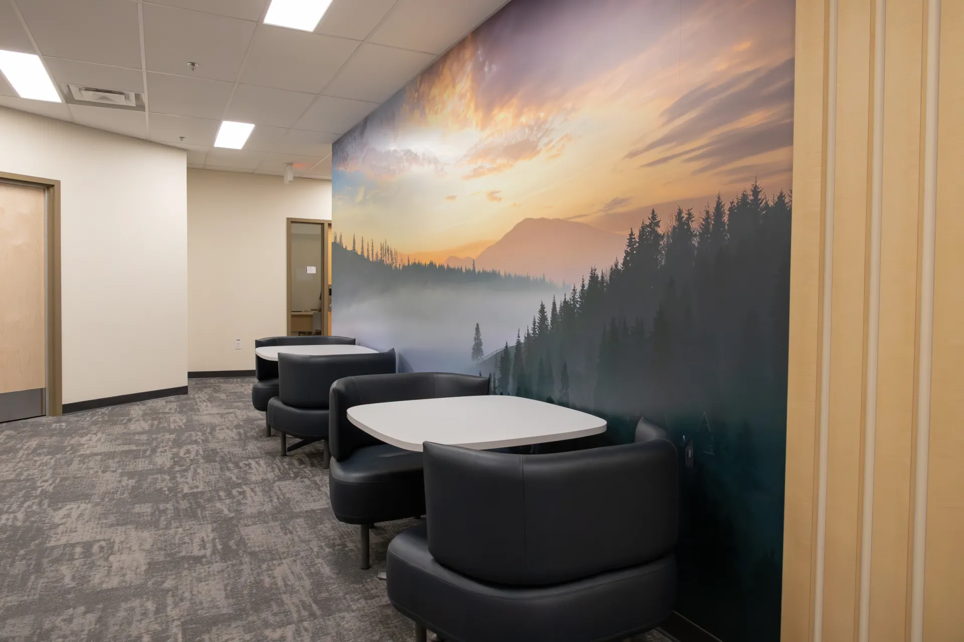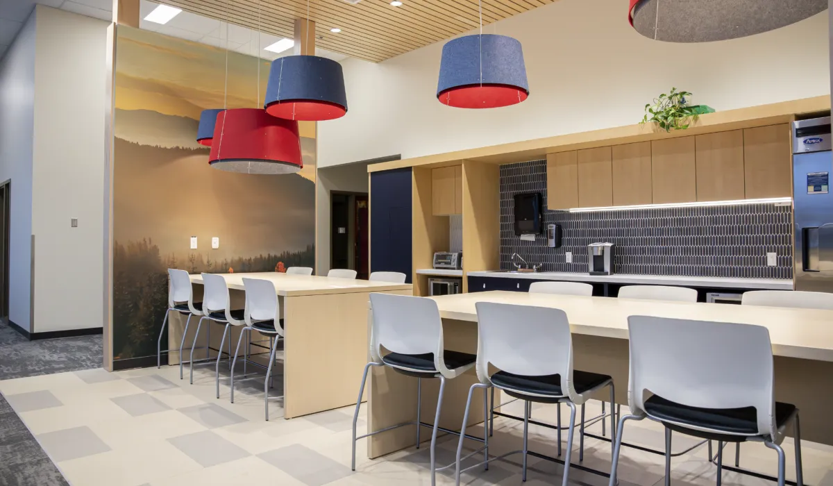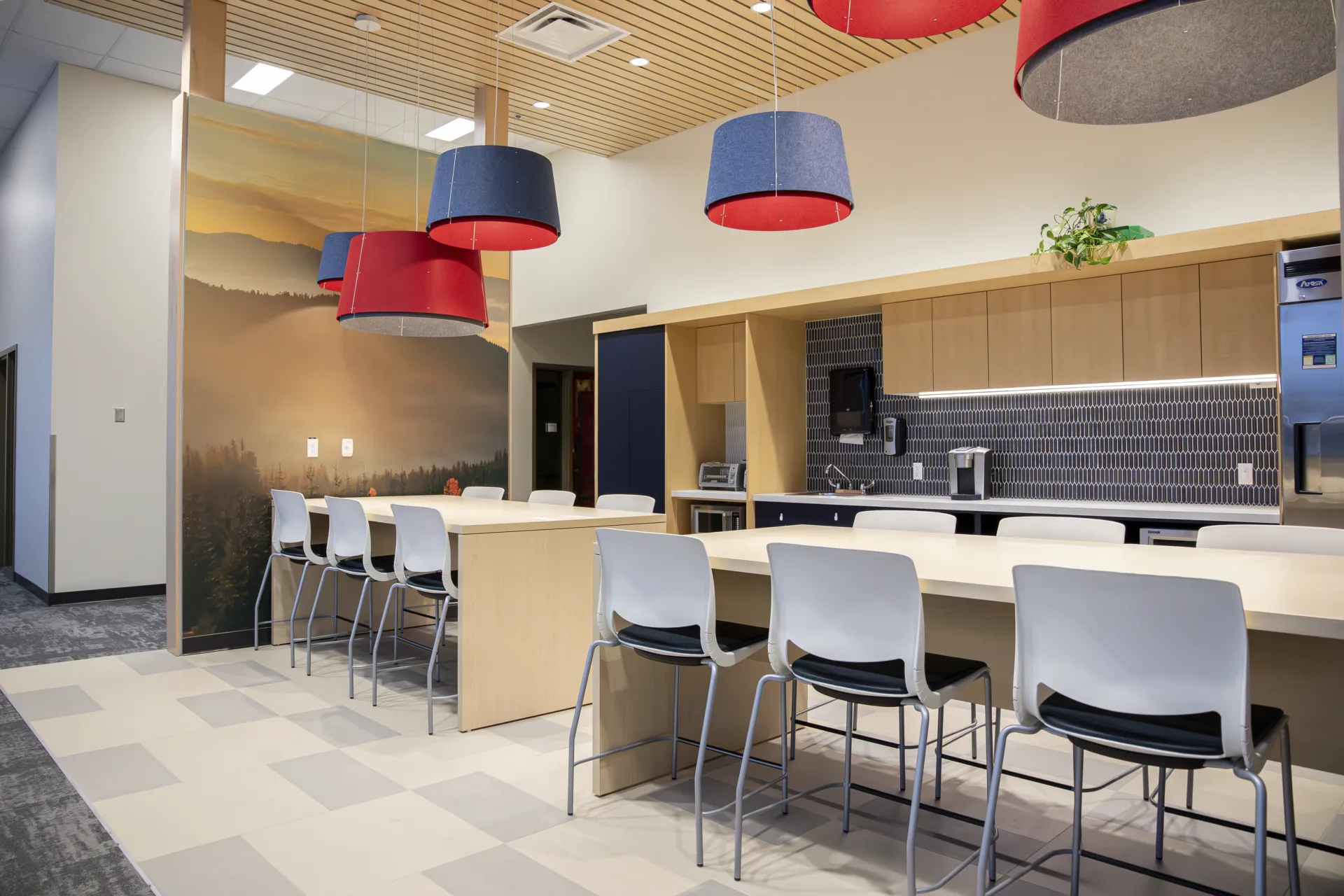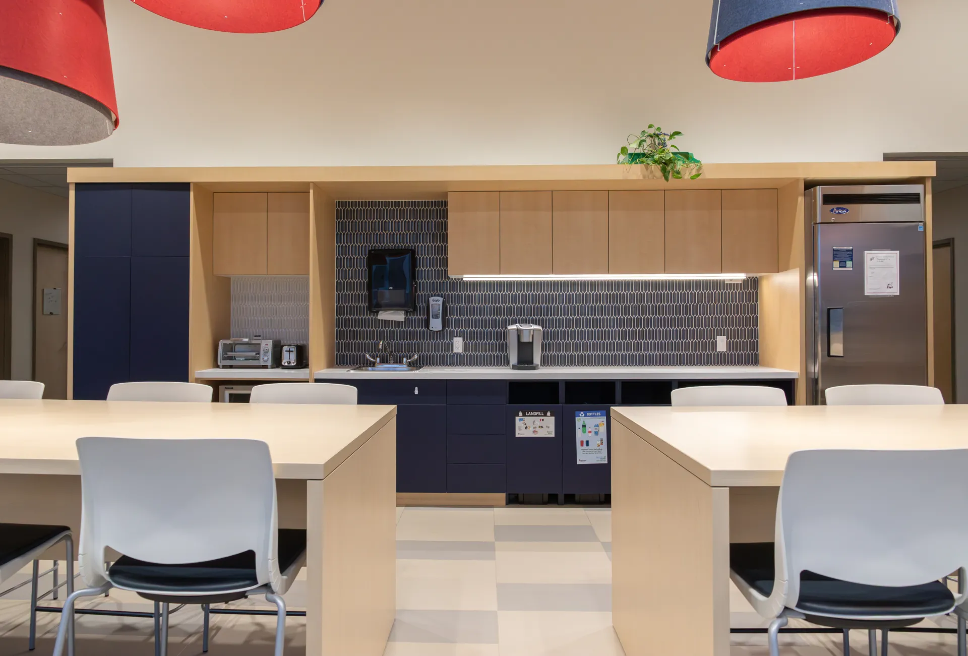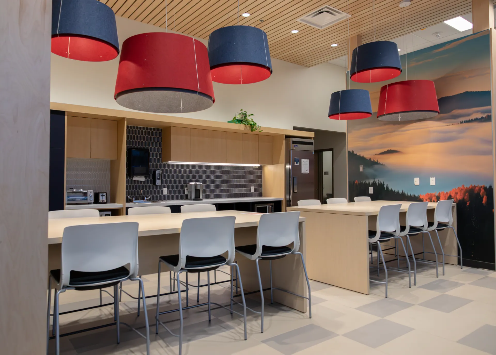 The restack introduces upgraded classrooms and shared instructional areas, including a purpose-built nursing teaching classroom with integrated headwall infrastructure and support spaces tailored to hands-on learning. Faculty offices and open workstations were reconfigured to promote collaboration, efficiency, and flexible use, while new staff amenity areas improve day-to-day functionality. An existing locker zone was transformed into gender-neutral, barrier-free washrooms, reinforcing inclusive access throughout the facility.