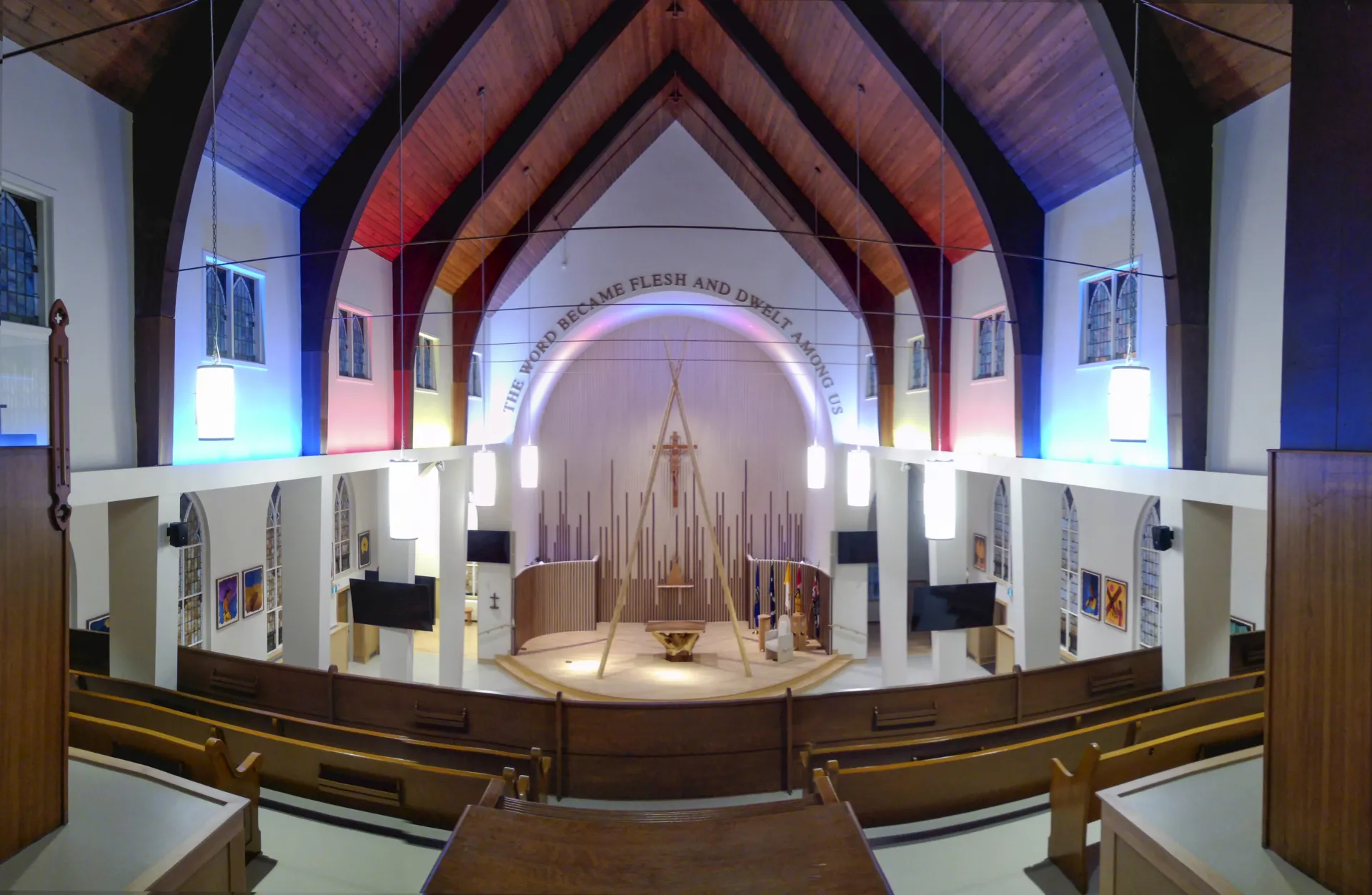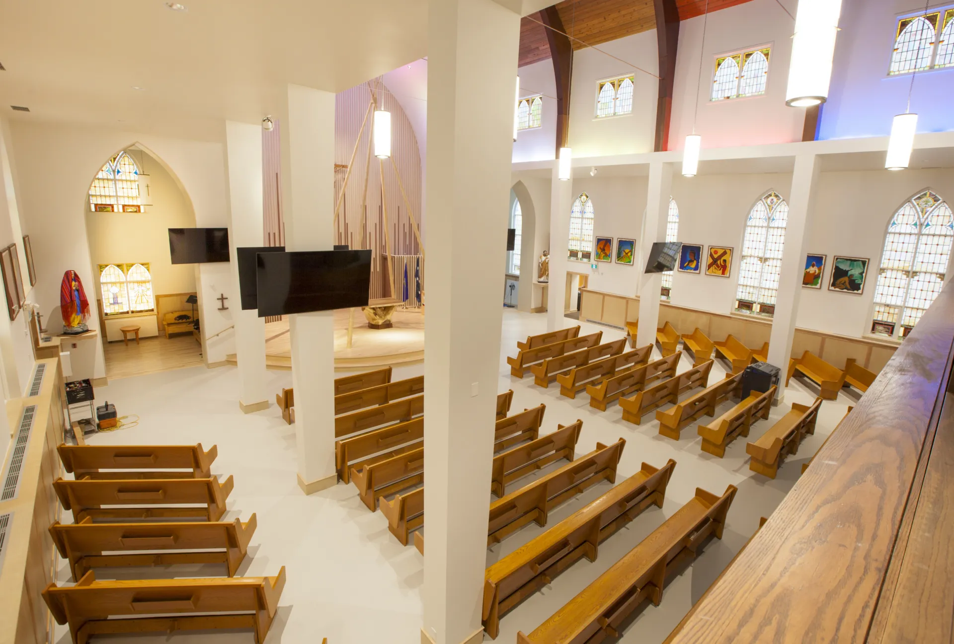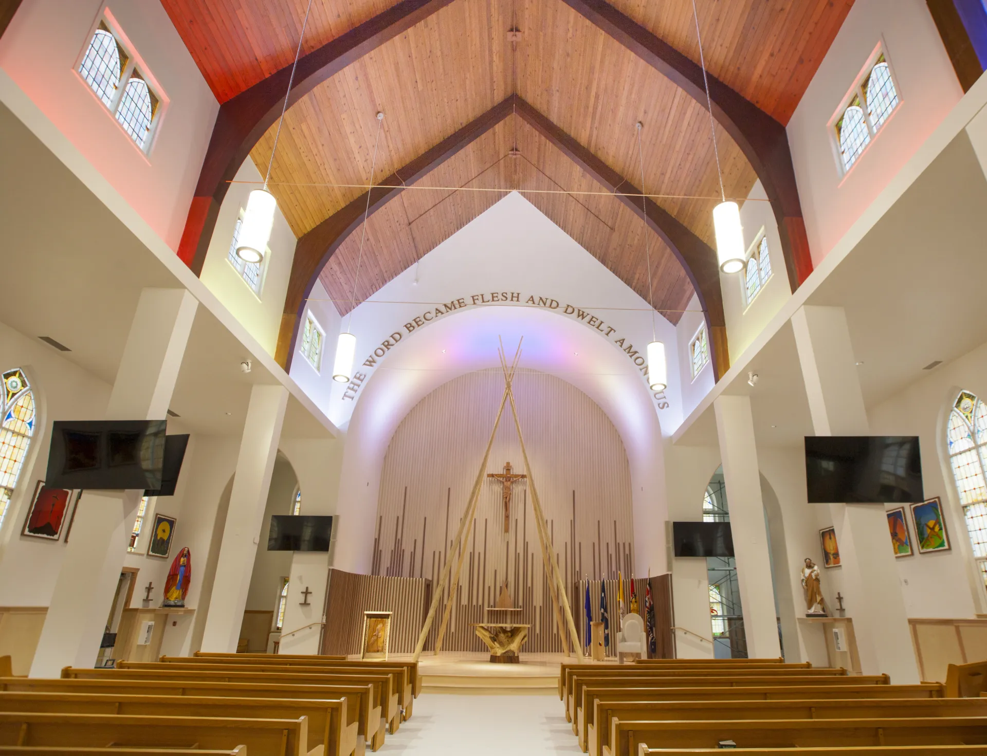 New lighting amplifies the expressive wood ceiling and reinforces the sense of height and reverence within the sanctuary. A restrained palette of wood slats behind the altar provides a quiet backdrop for the cross, which appears to float above the space. New windows introduce additional daylight into the side chapels, while durable flooring and finishes support long-term use throughout the church.
