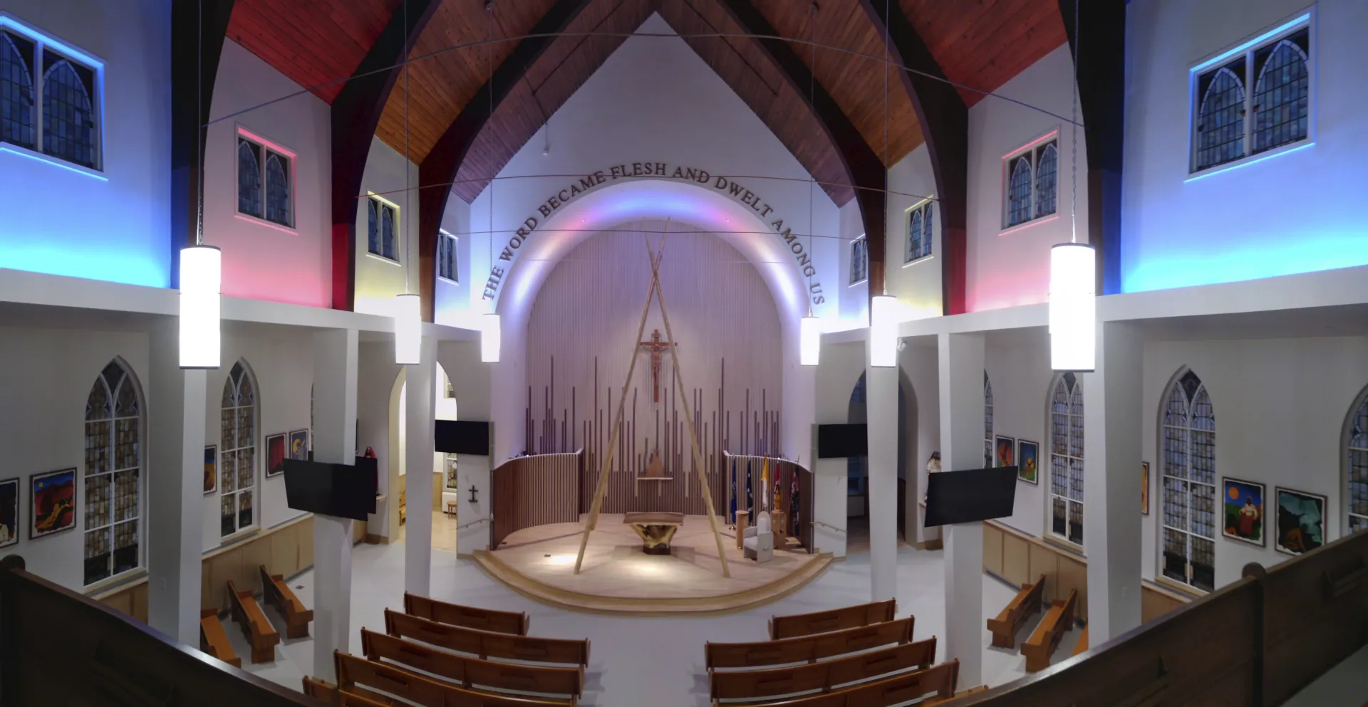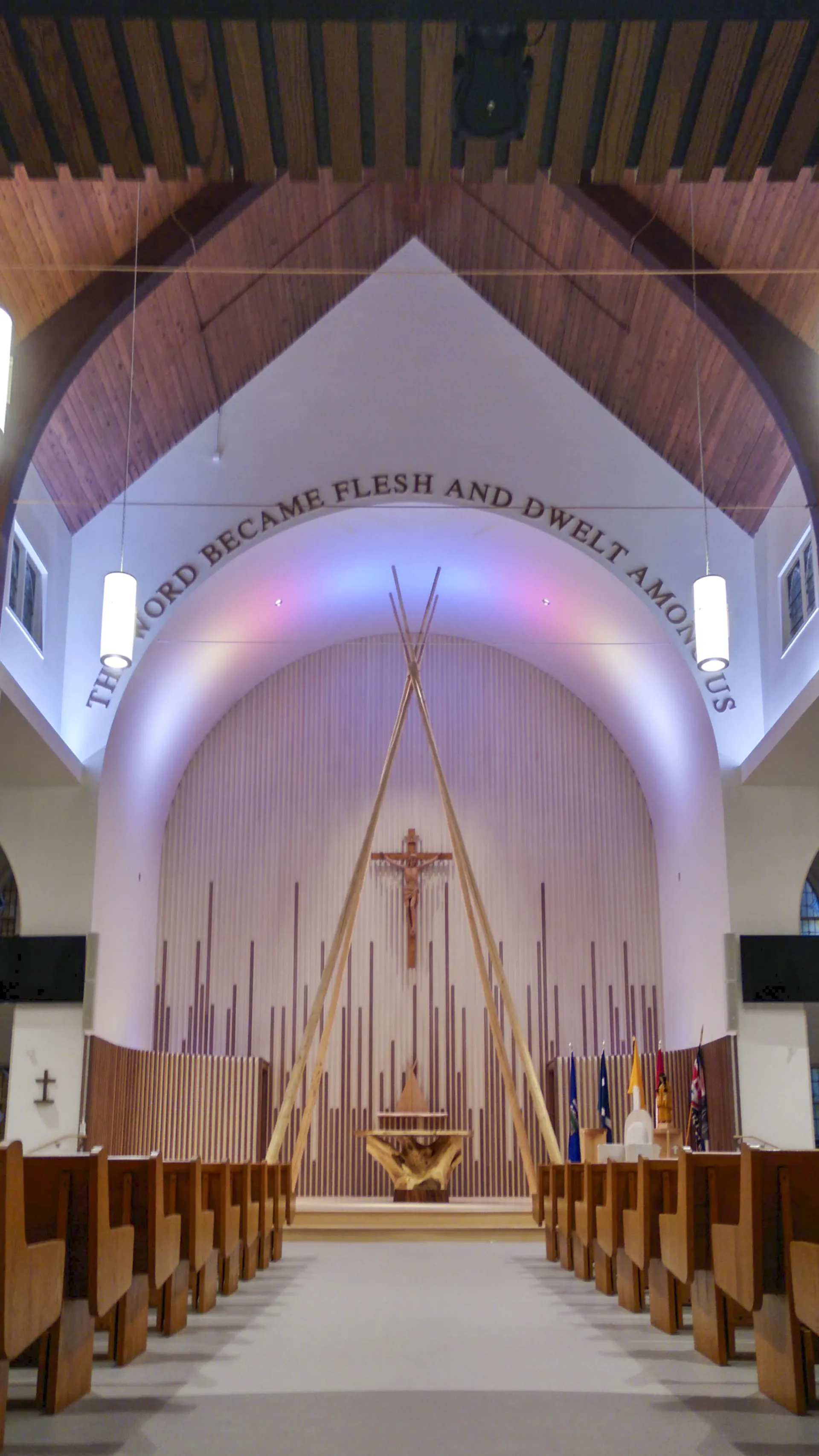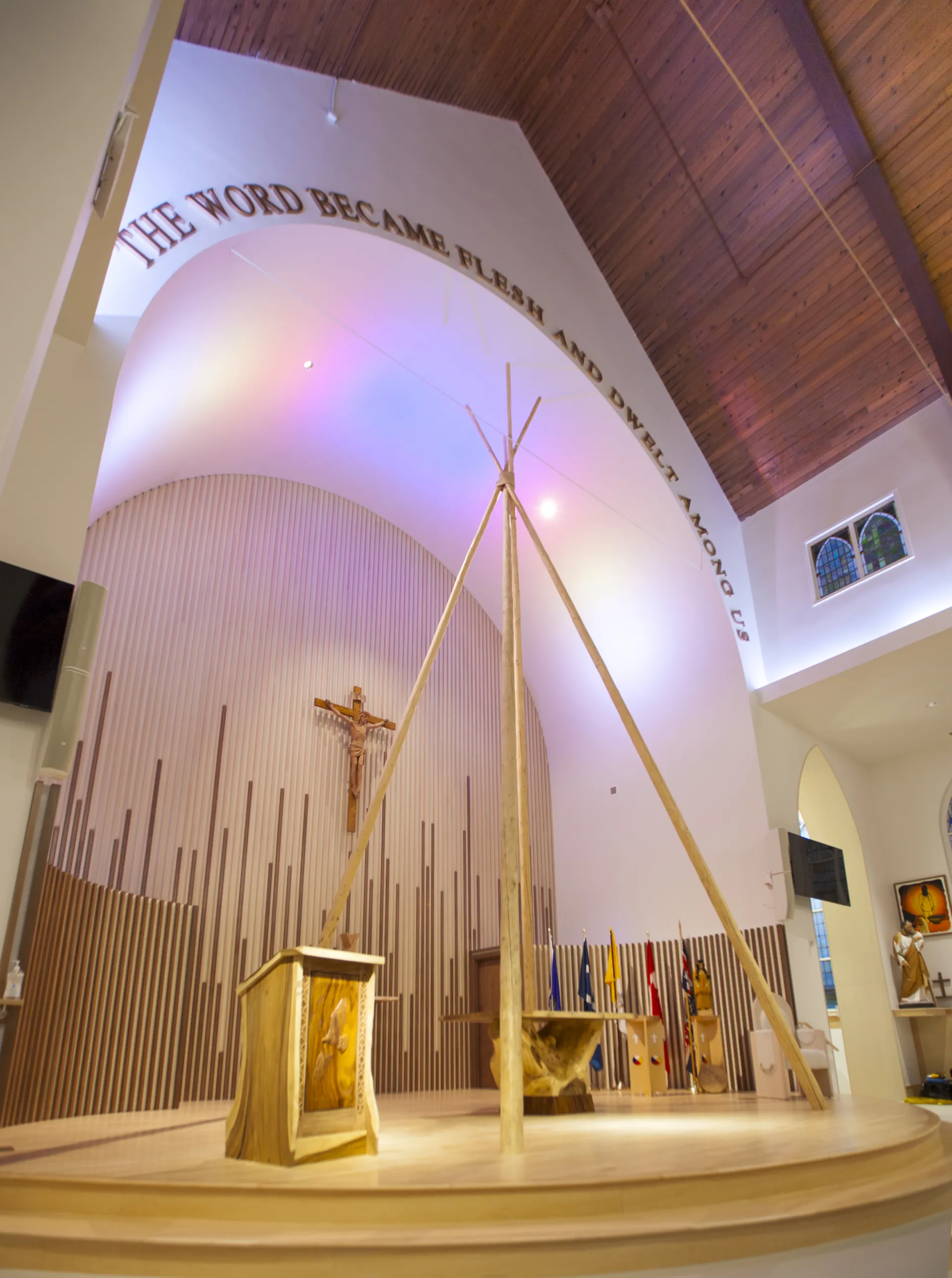 The restored interior emphasizes purity, simplicity, and the theological symbolism of the Trinity. Central to the sanctuary is an altar formed from a sculpted tree stump, anchoring the space through direct connection to the land. Above, four bare poles rise in the form of a teepee, expressing Indigenous presence and tradition within the sacred setting. Together, these elements establish a powerful focal point rooted in ceremony, culture, and community.